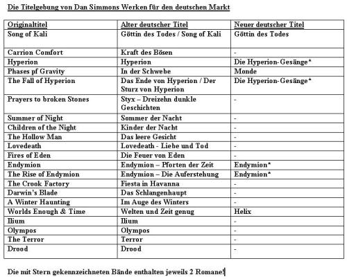 Der bis dahin in Deutschland durch HYPERION und ENDYMION fast nur in Kreisen der Science-Fiction-Fans bekannte Autor Dan Simmons sollte auch hier den Durchbruch erleben. Da Dan Simmons nicht gerade zu den Autoren gehört, die wie Fließband veröffentlichen, wurde er von den deutschen Verlagen eher stiefmütterlich behandelt und es gab kaum Promoaktionen für ihn, wie man sie z.B. von den Veröffentlichungen von Stephen King Romanen kennt. Stattdessen brachte Simmons im Schnitt alle zwei Jahre in neues Werk heraus. Ob Roman oder Kurzgeschichte, alle zeichnen sich durch enormen investigativen Fleiß aus, den Simmons an den Tag legt. Ferner tanzt er auch in mehreren Genres als da wären Science-Fiction, Horror, Historischer Roman, Krimi oder gar postmodernes. Nicht selten kommt es vor, dass ein Werk sich gar nicht so einfach zuordnen läßt, sondern genreübergreifend ist. Auf seiner Webseite schreibt Simmons auch selbst, dass er sich weder als Science-Fiction- noch als Horrorautor betrachtet und auch in gar keine Schublade gesteckt werden möchte. Was für den Fan ein Grund zur freudigen Erregung ist, welches Thema der Meister denn als nächstes anpackt, läßt die deutschen Verlage offensichtlich eher ratlos werden, wie um Himmels willen man seine Sachen denn an den Leser bringen soll. So kommt es, dass z.B. die drei Roman noir HARDCASE (2001), HARD FREEZE (2002) sowie HARD AS NAILS (2003), um den Privatdetektiven Joe Kurtz, noch gar nicht in Deutschland erschienen sind, obwohl sie auf dem amerikanischen Markt gut ankamen. Simmons hat halt hier noch keinen Namen im Segment Kriminalroman. Für nicht unerheblichen Unmut, gerade bei Altlesern, sorgt die Entscheidung des Heyne-Verlages einfach mal den Titel zu ändern, wenn ein Roman von Simmons wiederveröffentlicht wird. Dies trifft besonders auf die folgenden zwei Werke zu: WELTEN UND ZEIT GENUG {Festa-2004} = HELIX {Heyne-2008} und IN DER SCHWEBE {Heyne-1994} = MONDE {Heyne-2009}. Im Prinzip auch auf SONG OF KALI {Edition Phantasia-2004} = GÖTTIN DES TODES {Heyne-2009}, allerdings hatte Heyne diesen Roman schon 1991 auch unter dem eigenen Titel erstveröffentlicht. Trotzdem sieht man an IN DER SCHWEBE, dass es sich wohl weniger um ein lizensrechtliches Problem handeln dürfte, wie es beim Wechsel von einem Verlag zum anderen schon mal vorkommt, sondern eher um einen verkaufstechnischen Trick. Traurig. Vor allem, weil Dan Simmons selbst für diesen Zustand am wenigsten kann, aber am meisten geschädigt wird. Ich habe mal einen Überblick der bisher in Deutschland erschienen Titel von Dan Simmons erstellt: ![]() Vielleicht hilft diese ja den ein oder anderen Doppelkauf zu vermeiden. (Vorausgesetzt ein potentieller Käufer findet meinen Katzenblog bevor er sein sauer verdientes Geld fehlinvestiert LOL.) *** Um die Wogen etwas zu glätten und um trotz allem ein wenig Appetit auf den Autor Dan Simmons zu machen, möchte ich hier noch ausgewählte Rezensionen zu einigen seiner Werke präsentieren. Diese Rezensionen sind selbst schon kleine Meisterwerke und ich übertreibe nicht wenn ich sage, dass die Bekanntschaft der beiden Rezensenten mein Leben bereichert hat. Viel Spaß: - Dan Simmons: SOMMER DER NACHT - Dan Simmons: DIE HYPERION-GESÄNGE - Dan Simmons: ENDYMION - Dan Simmons: LOVEDEATH - Dan Simmons: IM AUGE DES WINTERS - Dan Simmons: KINDER DER NACHT - Dan Simmons: DIE FEUER VON EDEN - Dan Simmons: DAS SCHLANGENHAUPT - Dan Simmons: ILIUM - Dan Simmons: OLYMPOS - Dan Simmons: SONG OF KALI Schweigend ziehe ich den Hut, denn dem habe ich nichts hinzuzufügen. LG aus Shenzhen Jens ... link ... older stories
