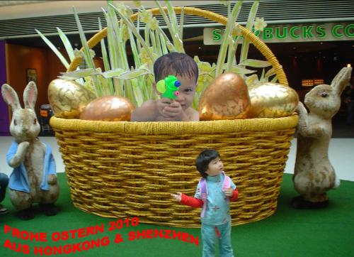Obwohl ich ja kulturell ziehmlich weit weg von euch lebe, kann ich mich nicht so ganz dem Osterfest entziehen, denn die Chinesen schmücken auch was das Zeug hält. Jedenfalls in den Shopping Malls: Dieser Korb steht übrigens im Elements, das ist der Shopping Mall, der über der U-Bahn-Station Kowloon, in Hongkong, aufgebaut worden ist. Ein gigantisches Teil. Der Zugang zur U-Bahn sieht so aus: Ihr kennt doch bestimmt alle die Marke PLaymobil, oder ? Im Schaufenster eines Ladens im Elements stehen diese 3 lebensgroßen Kerle: Interessant ist, dass offensichtlich deutsche Playmobilfigurren hier Pate gestanden haben. Aber das nur so nebenbei. Also, dann wünsche ich allen Verwandten und Freunde FROHE OSTERN und viel Spaß beim Suchen der Eier. LG aus Shenzhen Euer Junwen P.S. Ich habe mich übrigens in das oberste Bild eingeschlichen. Wer hat mich entdeckt ? LOL. ... link Donnerstag, 18. März 2010