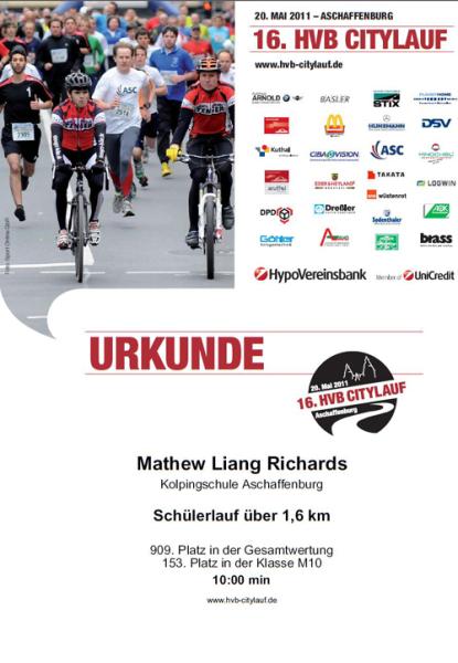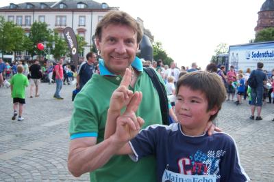 ![]() Die Urkunde O-Ton Birgit: "Fotos vom City Lauf Aschaffenburg - das Mega-Ereignis in unserer Kleinstadt. Und immer schon ein 3/4 Jahr im Voraus sind die Läufermeldungen ausgebucht. Vor dem Hauptlauf (7900 m) findet der Schülerlauf (1600 m statt). Der Lauf führt an Peters Laden vorbei zum Ziel (Schloßplatz). Klar, dass ich noch aufgeregter war als Mathew und früher Feierabend gemacht habe. Peter hat natürlich auch angefeuert. Und wie man sieht, hat sich Mathew auch gefreut." ![]() Erst nach den Kontrahenten umschauen, dann zum Endspurt: Mathew ganz traditionell mit chinesischer Schuluniformhose [kurzes Modell]:-) ![]() Das Feld im Licht ![]() Das Feld im Schatten ![]() Ächz, endlich am Ziel... ![]() ...aber "Yeah!" - Durchgehalten. ![]() Ist schon gut, dass Peter und Birgit auch da sind und gratulieren - wieso sind die beiden eigentlich nicht mitgelaufen? ![]() V for Victory - Peter sonnt sich in Mathews Ruhm Das Resultat: Mathew hat die 1600 m in schlappen 10 Minuten zurückgelegt (war wohl das ein oder andere Päuschen dabei). Das reichte für einen 153. Platz (von 221) in der Gruppe M10 und den 909. Platz in der Gesamtwertung. Und das trotz der Startnummer 1248, also nich gerade die Poleposition:-) Einen herzlichen Glückwunsch auch von uns aus Shenzhen! O-Ton Birgit: "Anschließend waren wir im Freibad schwimmen, rutschen und Turm springen. Doch leider keine Badebilder." O-Ton Jens: " Eine Schande. Mathews genialer Sprung vom 3-Meter-Brett hätte ruhig fototechnisch dokumentiert werden können." Samstag, den 21. Mai 2011: O-Ton Birgit: " Am nächsten Tag, Samstag, den 21.05. Mai waren wir baden, anschließend war Mathew beim Taek Won Do (hiervon leider auch keine Bilder)..." O-Ton Jens: "Kein Kommentar:( " O-Ton Birgit: "...und abends bei Rainer im Garten Grillen. Klar, dass auch Peter und Mathias mit von der Partie waren. Weil die Wurst natürlich verdient sein musste, haben Peter und Mathew auf der Wiesen neben dem Garten fleißig gekickt. Mein Apparat kann leider weder schnell belichten noch überhaupt in der Dämmerung gut belichten. Aber man sieht schon, wie sich die beiden gegenseitig foppen." ![]() In Rainers Garten ![]() Anstoss Mathew ![]() Anstoss Peter ![]() Um jeden Ball wird hart gekämpft ![]() Kann Stürmer Peter Verteidiger Mathew überwinden? ![]() Ja Sonntag, den 22. Mai 2011: O-Ton Birgit: "Am Sonntag, 22.05.2011 war eine Art Vereinsfest angesagt: das Spassfliegen. Zum Fliegen sind wir nicht viel gekommen, der Wind war viel zu stark und bockig, dafür haben wir und vor allem Mathew uns trotzdem gut amüsiert." ![]() Born to be wild O-Ton Birgit: "Mathew hat von 9h00 bis 18h00 Fußball gespielt, am Fluss gespielt, Fußball gespielt, Würstchen gegessen, Fußball gespielt, Moped gefahren, Moped gefahren, Moped gefahren, Fußball gespielt, Fußball gespielt..... alles bei 26 ° . Und glaubst Du er wollte danach duschen? Nein. Ein Geschrei. Aber baden findet er cool und so hat er wie eine Diva ein Schaumbad genommen." ![]() Wild Thing ![]() Highway to hell ![]() So ein Motorrad ist eine feine Sache ![]() Das ist sein Besitzer: Luka ![]() Alexander mit dem großen Daumen ![]() Alexander und der Kleinwagen ![]() Werner ![]() Mathias ![]() Mathew ![]() Das Leben ist ein Drahtseilakt ![]() Und manchmal ist etwas Unterstützung schon gut ![]() Na, geht doch ![]() Meditation auf dem Hochseil O-Ton Jens: "Wo sind die Fotos vom Schaumbad?" ... link Montag, 23. Mai 2011
